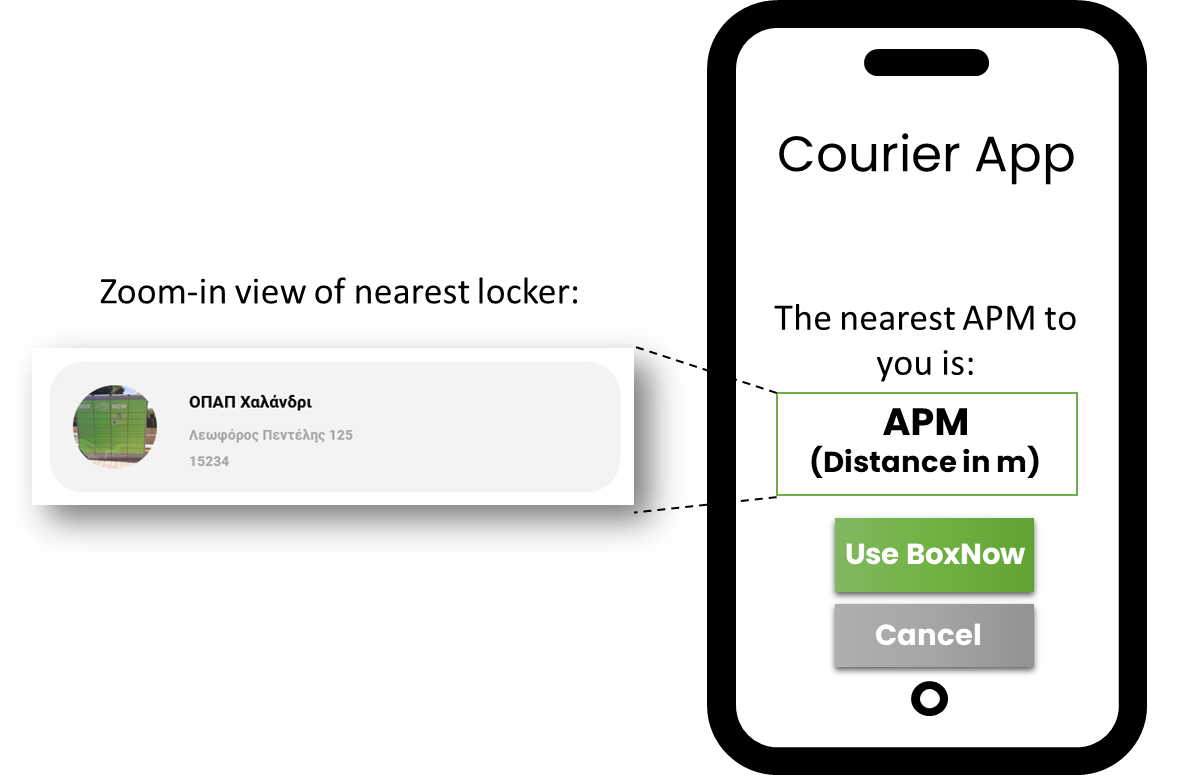 Με βάση τη καταχωρημένη πληροφορία γίνεται κλήση στο API της BoxNow και γίνεται σάρωση περιοχής (με βάση τη διεύθυνση του τελικού χρήστη) ώστε να βρεθεί κοντινό locker για παράδοση.