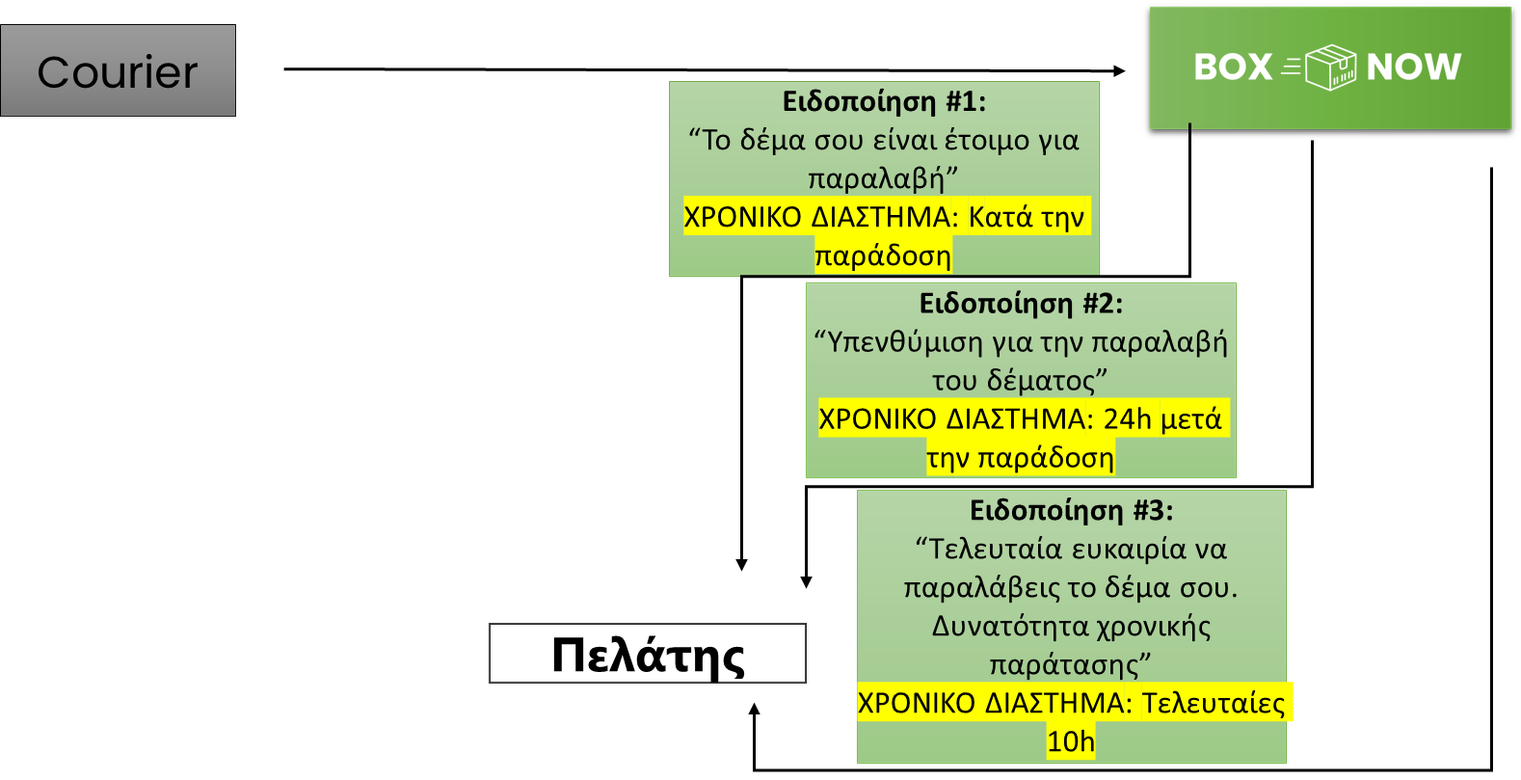 Απο τη στιγμή που η παραγγελία έχει παραδοθεί επιτυχώς στο Box Now locker, η Box Now αναλαμβάνει την πλήρη ενημέρωση του πελάτη, ώστε να παραλάβει την παραγγελία του με τα απαραίτητα στοιχεία (PIN, Θεσιθεσία locker κ.α.)