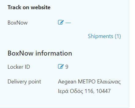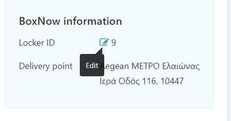 Μέσα από την παραγγελία έχετε την δυνατότητα εφόσον σας ενημερώσει η BOX NOW και εφόσον δεν έχετε δημιουργήσει Voucher για την παραγγελία, να αλλάξετε το pickup point του πελάτη, πατώντας διπλα απο το locker ID.