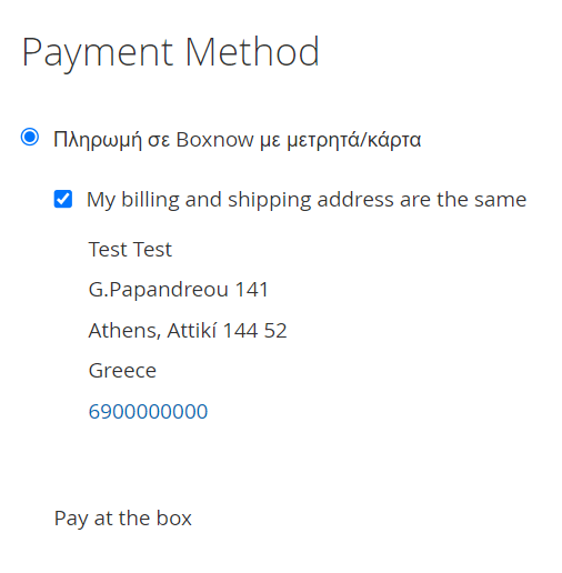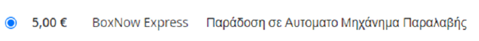 Αν ο πελάτης έχει επιλέξει την BOX NOW σα τρόπο παράδοσης στο προηγούμενο βήμα, θα έχει δυνατότητα στην σελίδα πληρωμής, να επιλέξει ‘Πληρωμη σε BOX NOW με μετρητά/κάρτα’. Η συγκεκριμένη μέθοδος δεν έχει κάποιο επιπλέον κόστος.
