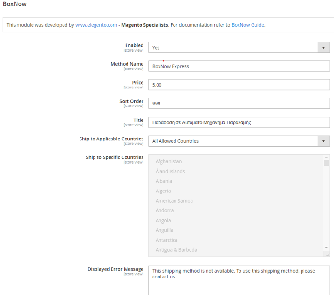 Σε αυτό το σημείο πρέπει να αλλάξετε τη BOX NOW μέθοδο πληρωμής σε Enable: “Yes” και επιβεβαιώστε πως είναι ενεργοποιημένο για το σωστό Store View ή Website επίσης.