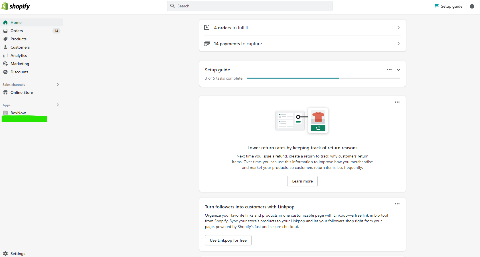 Στη συνέχεια στο διαχειριστικό του Shopify στην κατηγορία app θα εμφανιστεί η επιλογή της BOX NOW.