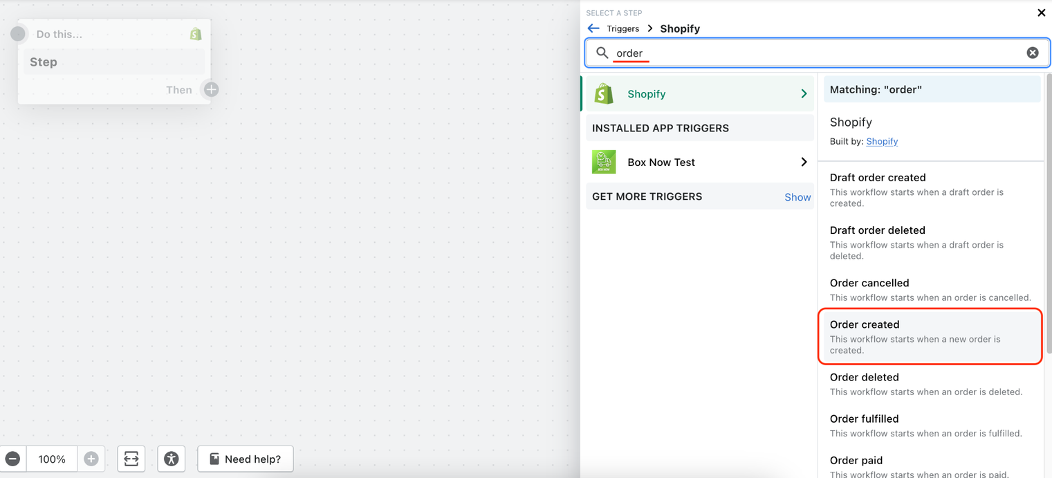 Πατήστε πάνω στο κουμπί Select a trigger και ξεκινήστε φτιάχνοντας την συνθήκη που θα ξεκινάει το workflow μας. Στην συγκεκριμένη περίπτωση, θέλουμε με το που δημιουργηθεί μια παραγγελία, να ελέγχεται αν στο checkout επιλέχθηκε locker της BoxNow για παράδοση, και αν αυτό ισχύει, να της βάζει ένα order tag “box-now” στο διαχειριστικό σας.