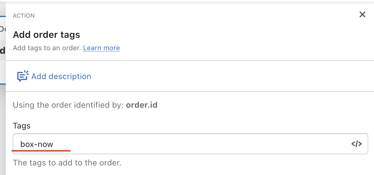 Εδώ, θα ρυθμίσετε την διαδικασία που θα εκτελείται όταν ισχύει η παραπάνω συνθήκη. Στο μενού που θα εμφανιστεί στα δεξιά, μπορείτε ήδη να δείτε και να πατήσετε το action “Add order tags”, αλλιώς αναζητήστε το στο Search και πατήστε το.