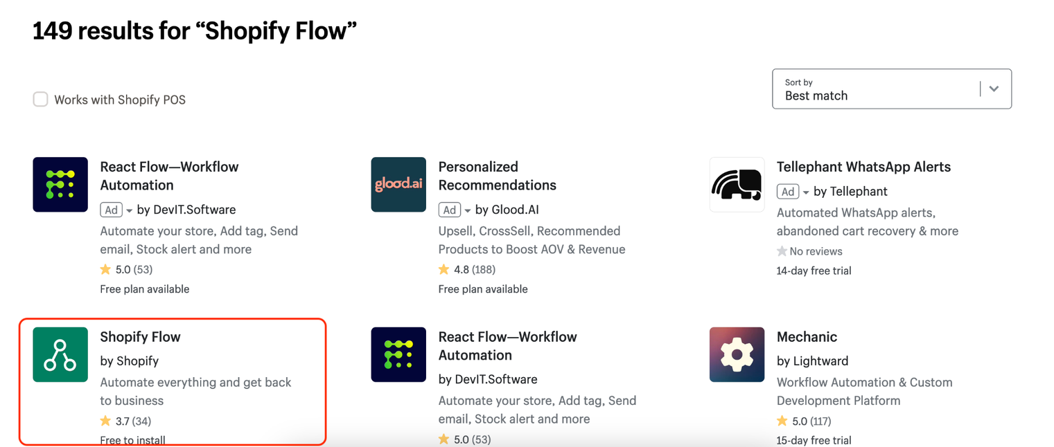 Στη συνέχεια, πατάμε το κουμπί που λέει Search for “Shopify Flow” in the Shopify App Store και αφήνουμε τον περιηγητή να μας πάρει στο app store του Shopify. Από την καινούρια σελίδα που έχει ανοίξει, πατάμε το Shopify Flow by Shopify.